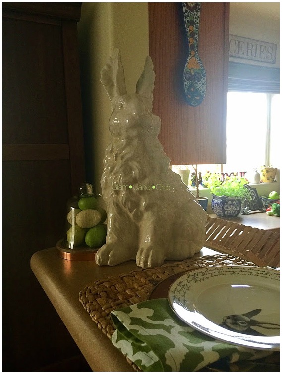 Love the rabbit plate and the all the ceramic bunnies. The vase and lemon tree give it a nice touch.